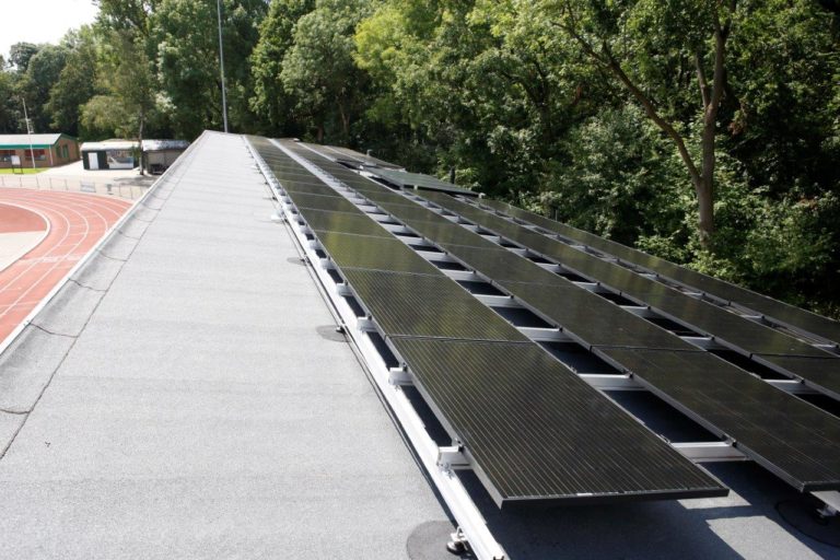 66 zonnepanelen 300 Wp op de hoofdtribune.